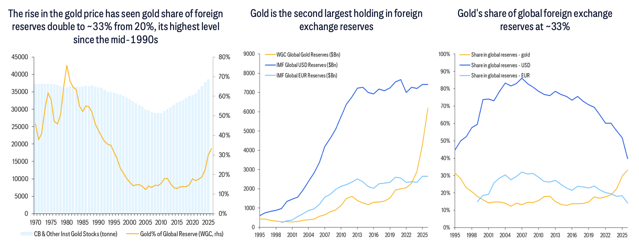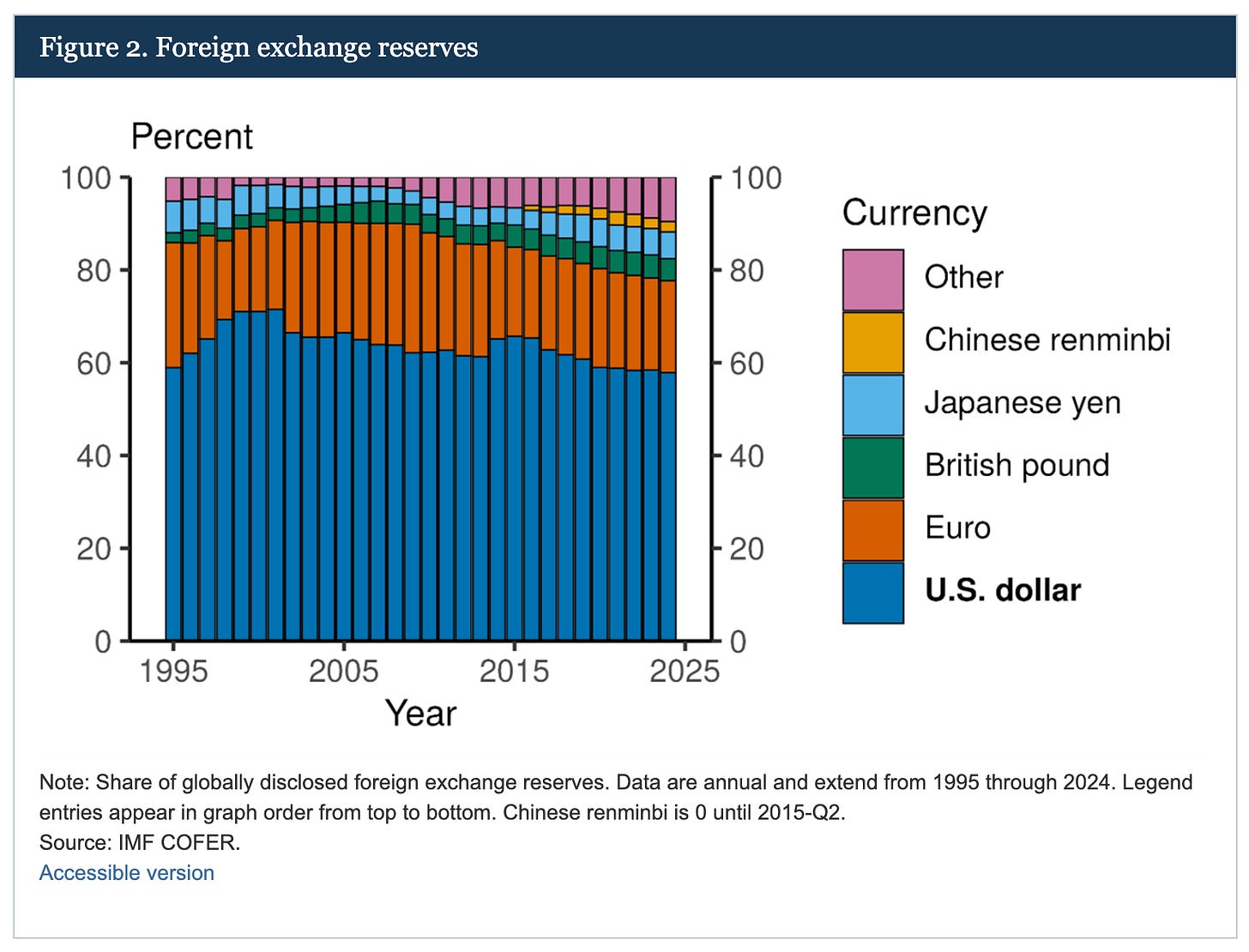 The dollar still dominates with roughly 59% of global foreign exchange reserves are held in US dollars. But that dominance is eroding. The euro’s share is stable. The renminbi’s share has doubled from 2% to nearly 5% in five years. Gold’s share has been creeping up.