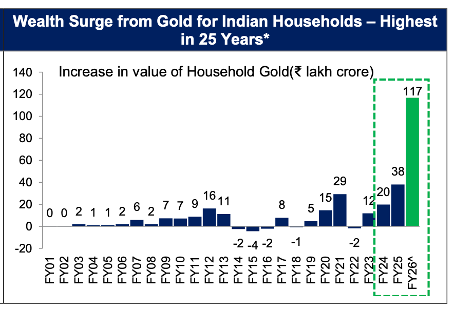 For Indian households that accumulated gold over decades at prices ranging from $300 to $1,500 per ounce, this represents a massive wealth gain. Every ₹1,000 per gram increase in gold prices adds nearly ₹1 lakh to average household wealth through mark-to-market gains.