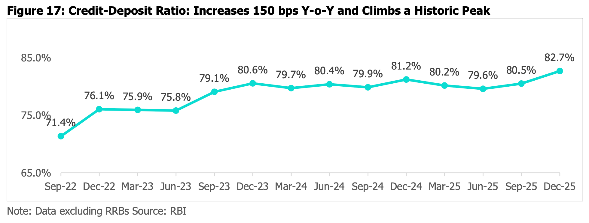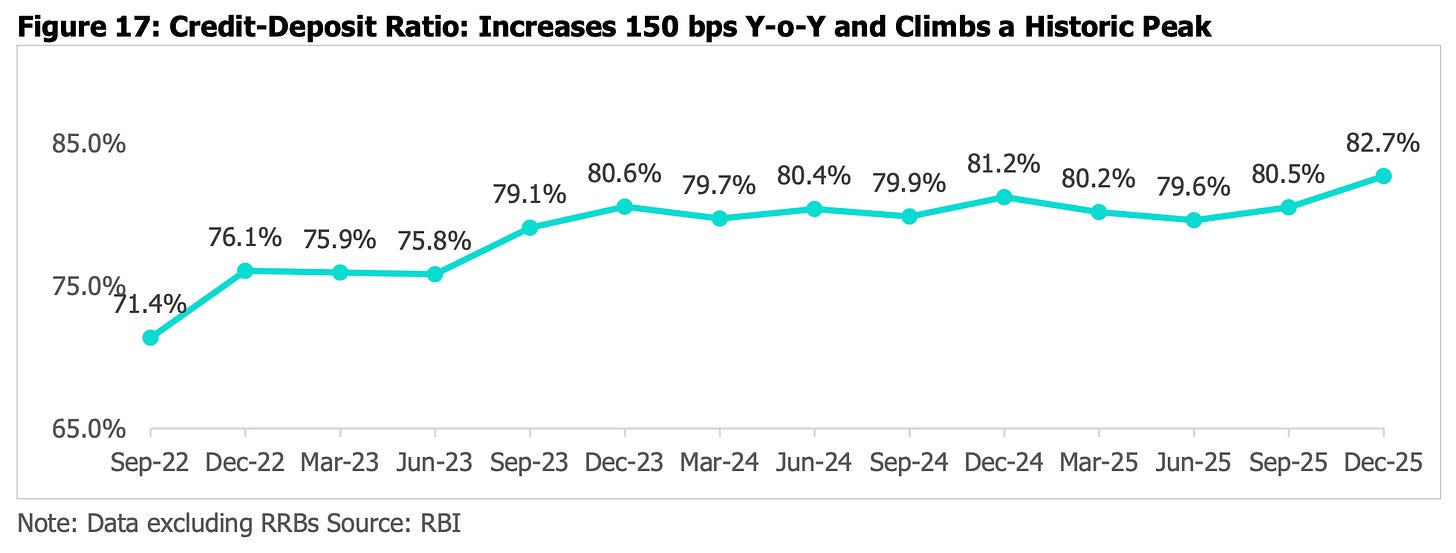 There’s a structural squeeze too. India’s Credit-to-Deposit ratio has hit a historic peak of 82.7%. Banks are lending faster than they’re collecting deposits. Credit is growing at 12.2%. Deposits at just 10.2%.