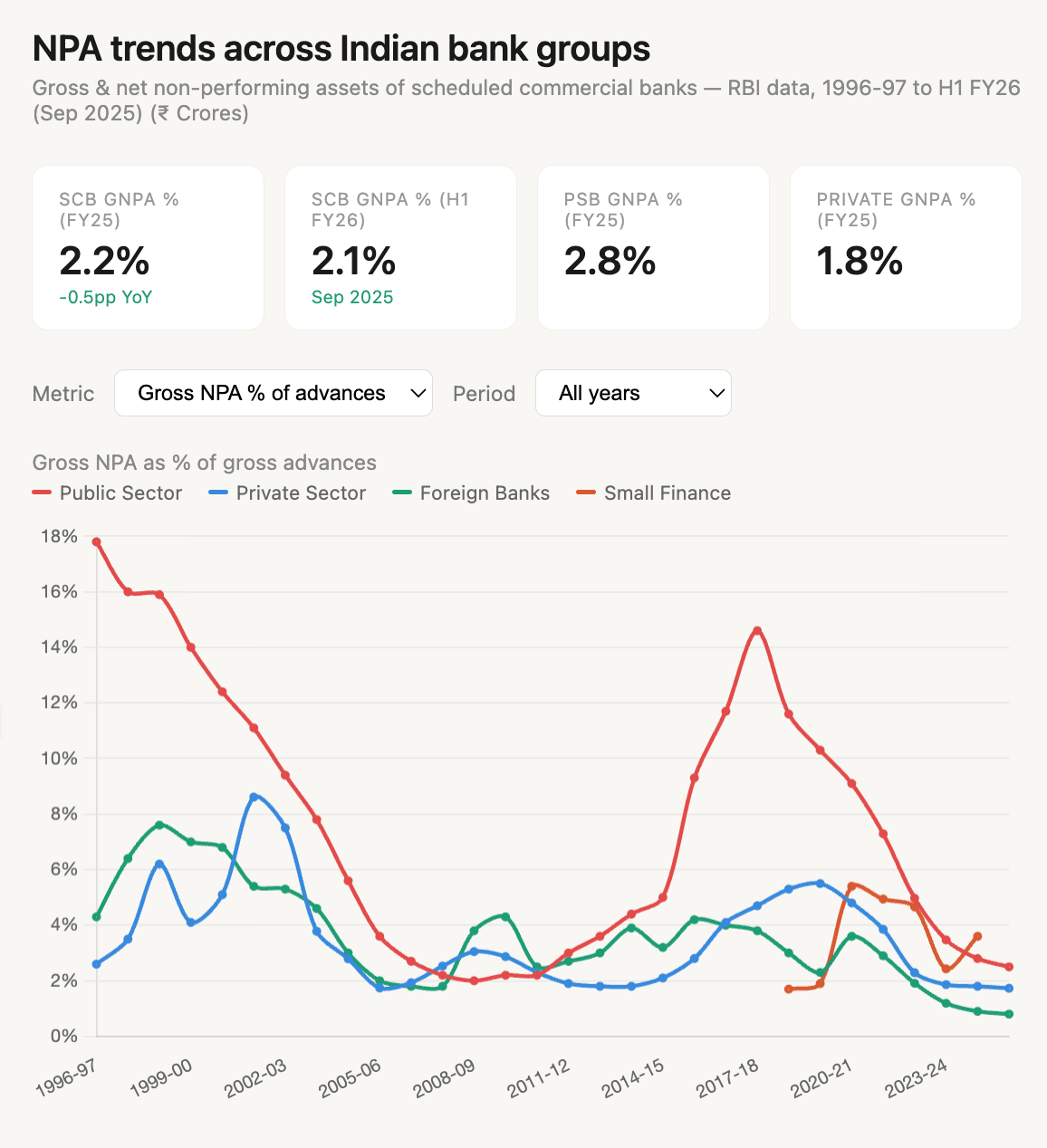The NPA chart from RBI data tells this story visually, three decades of bank defaults, and the current numbers are at the absolute floor.