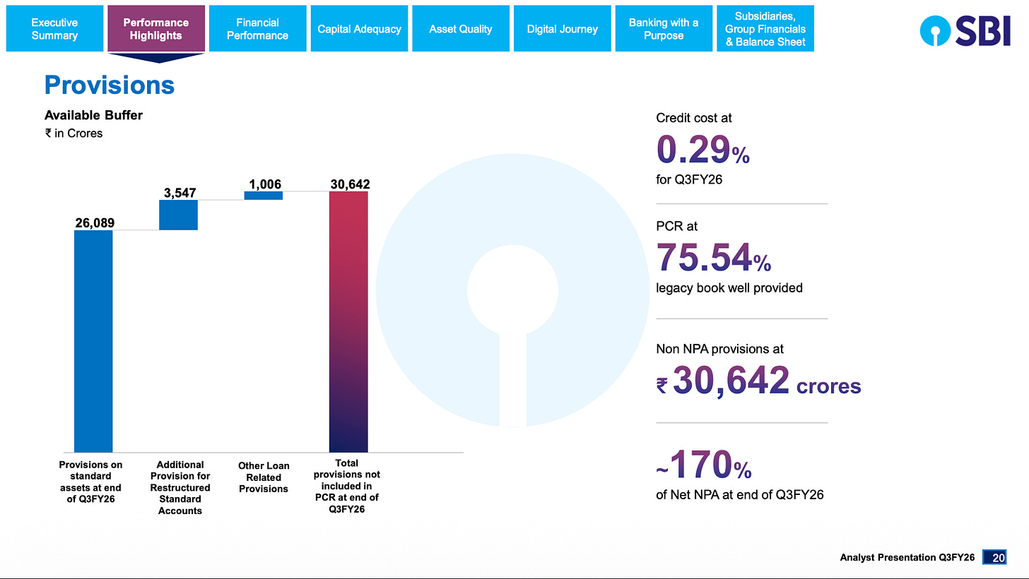 Major banks are running PCR of 75-83%. SBI’s coverage, including certain recovery accounts, is 92.4%. For every ₹100 of bad loans on SBI’s books, loans that already represent just 1.57% of the portfolio, ₹92 is covered.