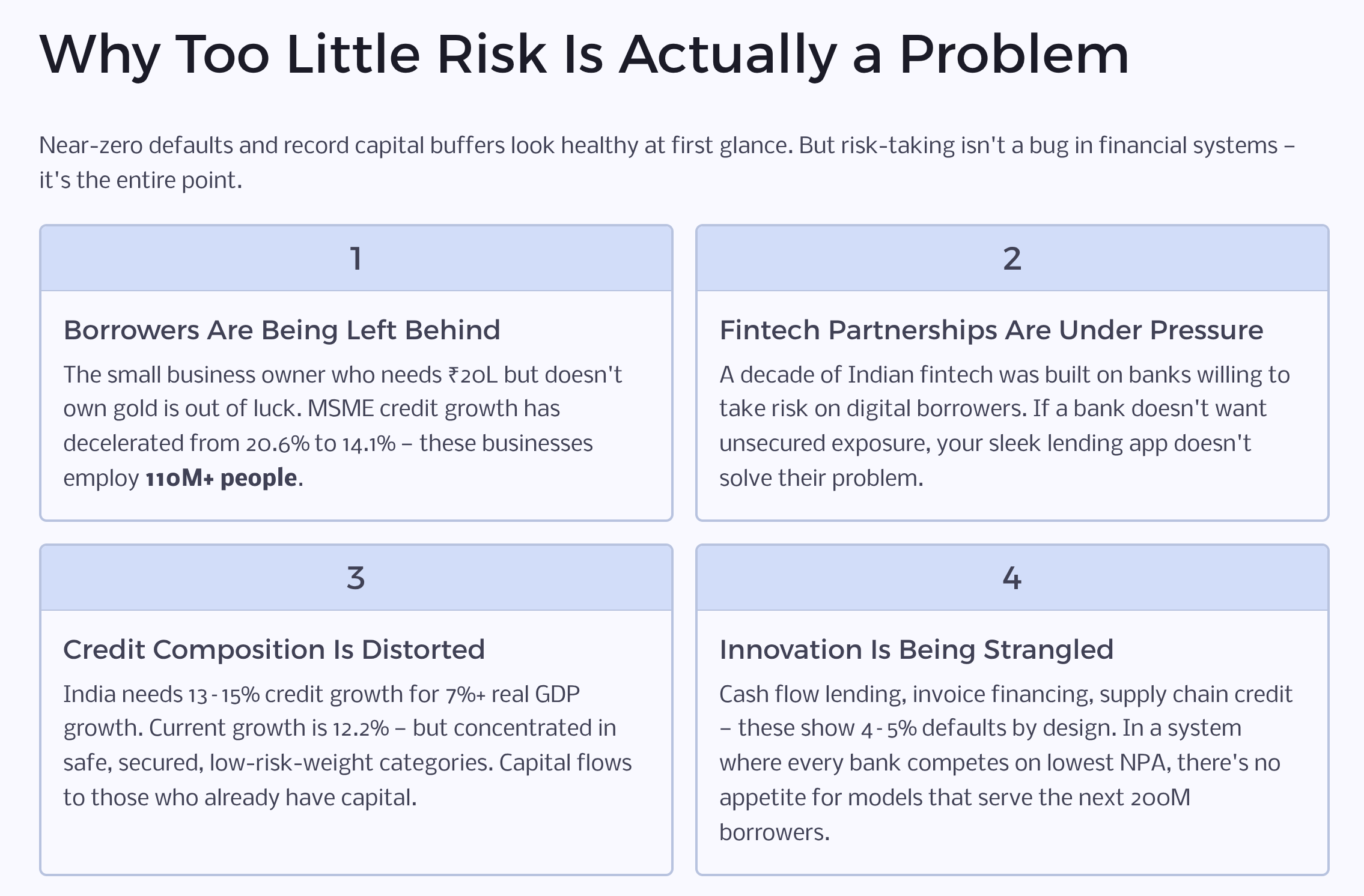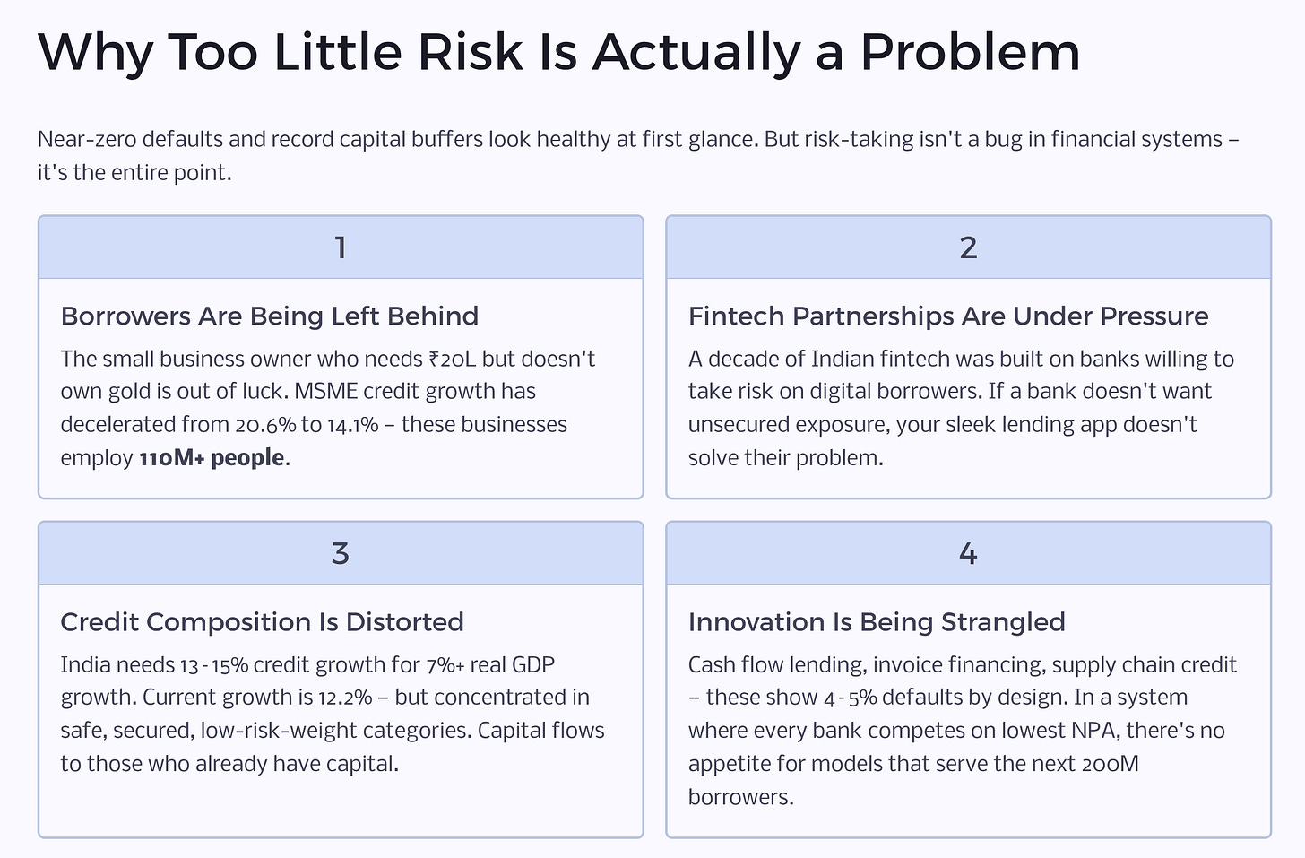 For innovation, excessive caution kills experimentation. Cash flow-based lending, invoice financing, supply chain credit - these models have higher default rates than gold loans. That’s by design. They serve riskier segments at higher yields, and when done well, the portfolio economics work. But in a system where regulators are raising risk weights on unsecured lending and banks are competing on who can have the lowest NPA, there’s no institutional appetite to underwrite models that might show 4-5% defaults even if they’re highly profitable.