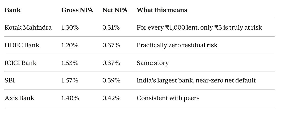 Net NPAs of 0.3% to 0.4%. Even the NBFCs (Non-Banking Financial Companies, lenders that operate outside the traditional banking structure) are showing extreme discipline: Bajaj Finance at 0.44% net NPA, Sundaram Finance at 1.06%, HDB Financial at 1.25%.