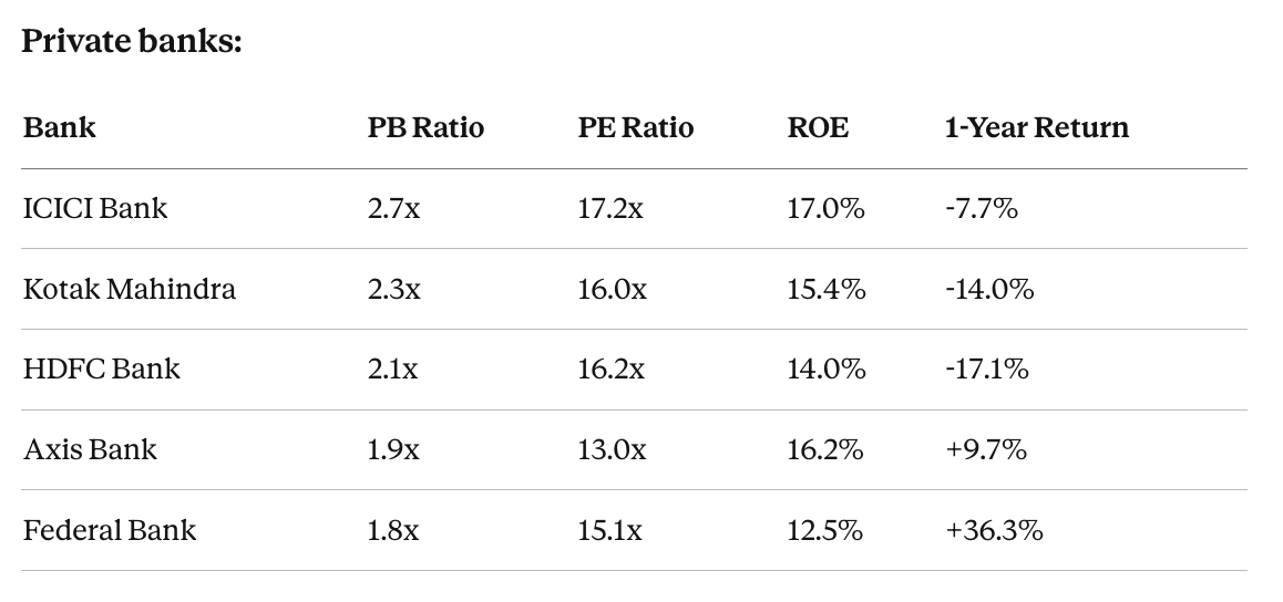 HDFC Bank at 2.1x is notable. This bank historically commanded 3-4x book because of its perceived governance premium. Between merger integration, NIM compression, and a recent governance episode, the market has taken roughly 50% off the valuation premium.