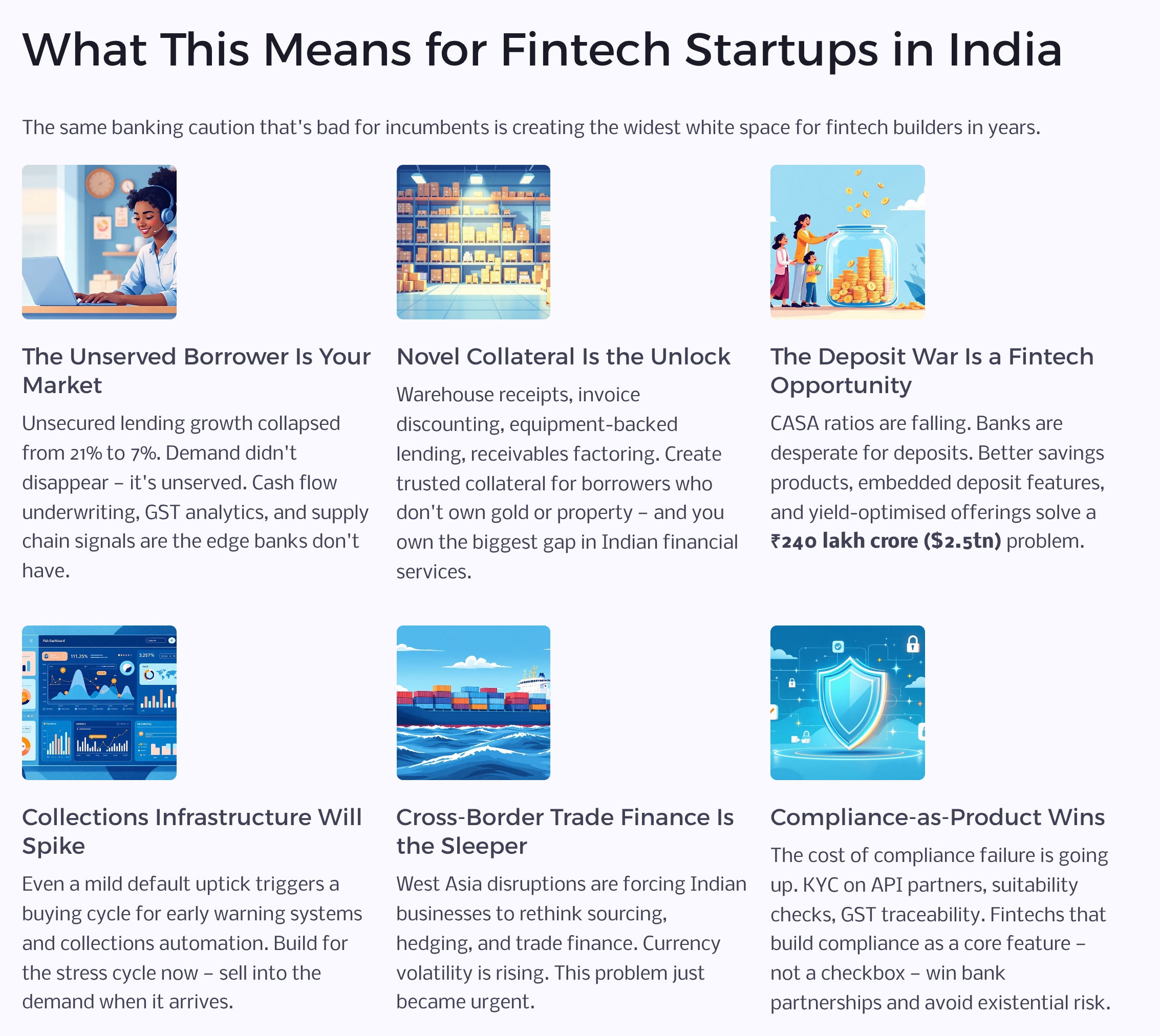 Cross-border and trade finance is the sleeper. Supply chain disruptions from West Asia will force Indian businesses to rethink sourcing, hedging, and trade finance. Currency volatility is rising. Cross-border payment efficiency matters more. This is a problem that just became urgent.
