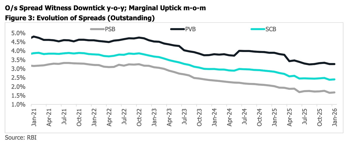 The CASA ratio, the share of lower cost current and savings account deposits, has dropped to ~38%. Retail investors have found better options: mutual funds, equities, higher-yielding fixed deposits. Banks are fighting a brutal war for deposits, which keeps funding costs sticky even as the RBI cuts rates.