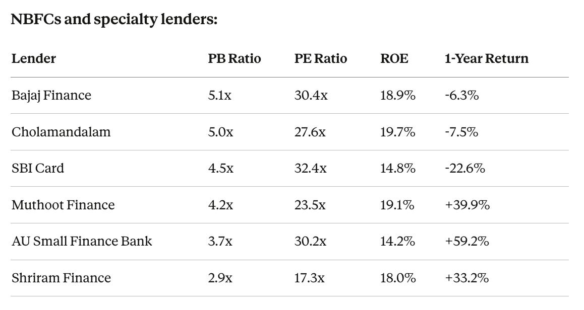 The standout story: Muthoot Finance at 4.2x PB and 40% returns, built entirely on the gold loan boom. The lender who holds your gold in a vault and gives you 70% of its value is outperforming everyone. What does that tell you about this system’s appetite for risk?
