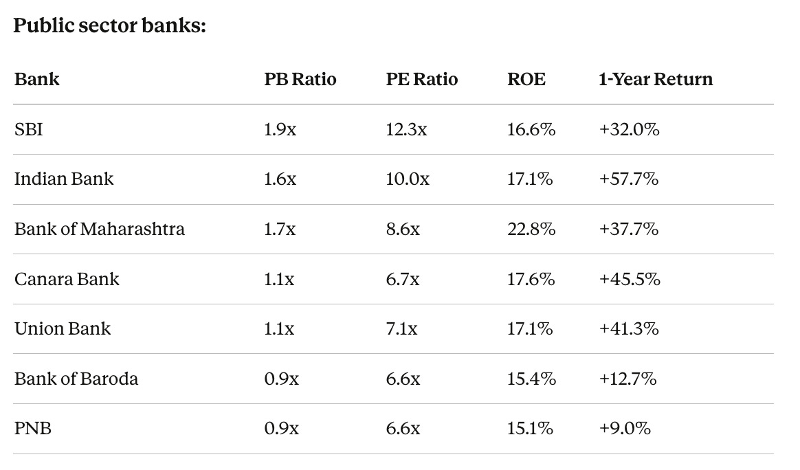 PNB and Bank of Baroda at 0.9x book. Sub-book-value with 15%+ ROE and net NPAs under 0.5%. Five years ago these banks were genuinely distressed, sub-book made sense. Today, the balance sheets are clean and the market still doesn’t fully trust them. Either the deepest value in Indian equities, or the market correctly pricing in the risk that PSU bank management will eventually find a way to squander the turnaround.