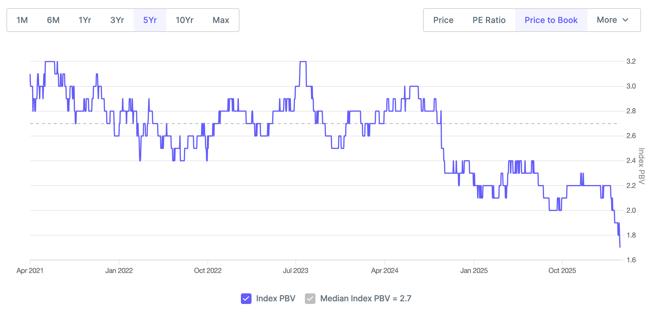 The Price-to-Book (PB) ratio tells you how much investors are paying for each rupee of a bank’s net assets. A PB of 1.0x means the market values the bank at exactly its book value (assets minus liabilities). Above 1x means investors believe the bank will generate returns above its cost of capital. Below 1x usually signals distrust.