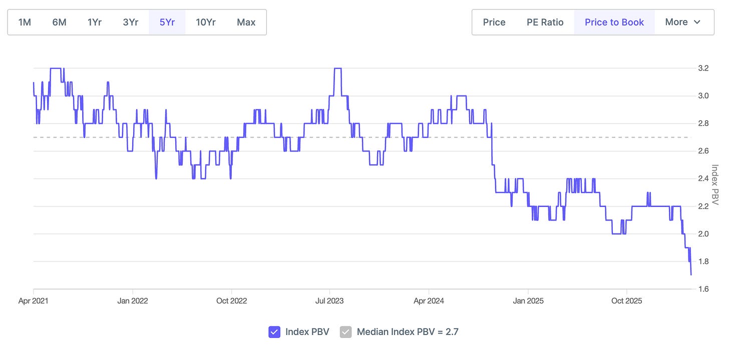 The Bank Nifty currently trades at about 2.2x PB. Over five years, this has ranged from 1.6x (COVID panic, March 2020) to 3.2x (2023 bull run). We’re in the middle of the range i.e. not cheap, not euphoric, but trending downwards.